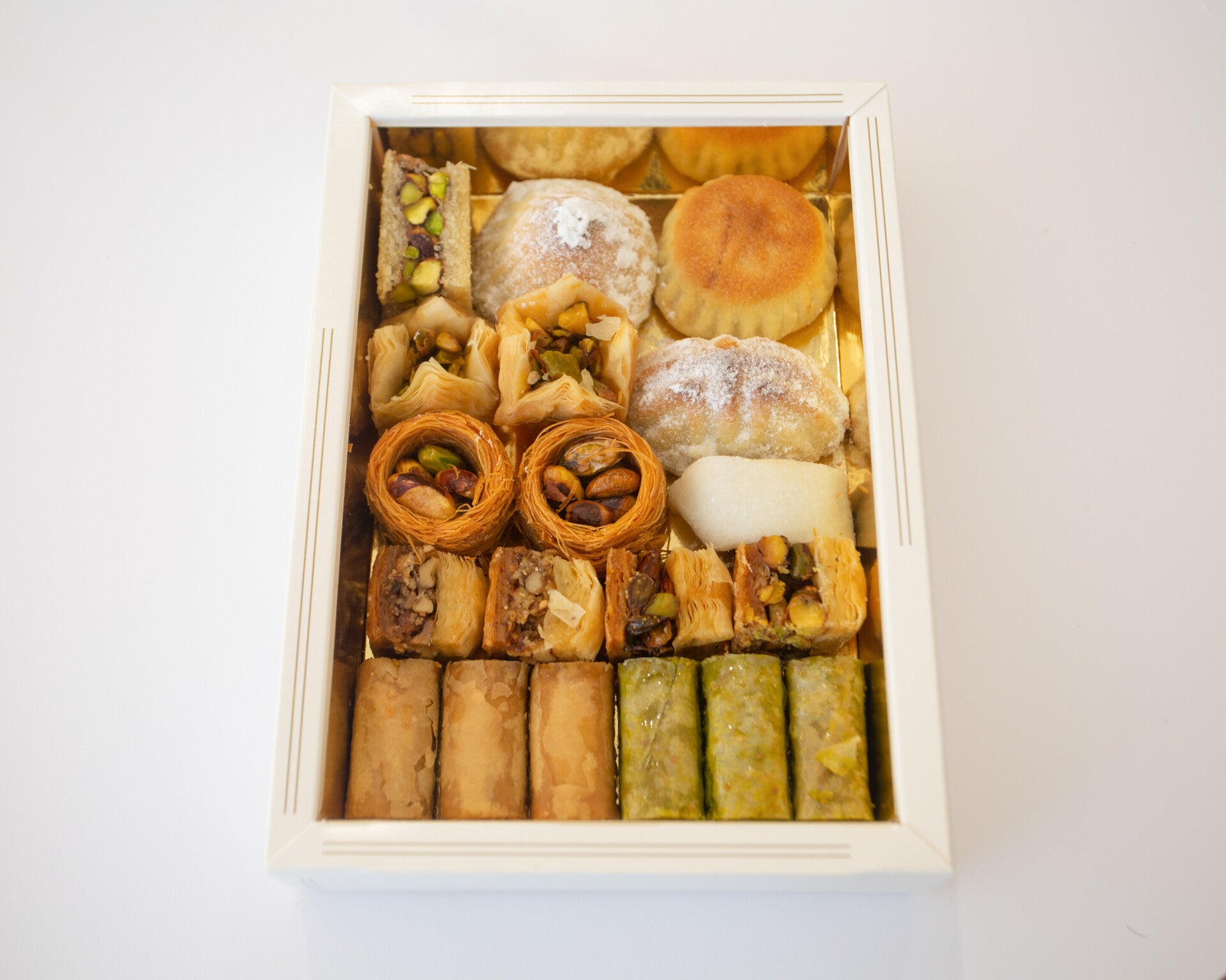 Hand selected sweets in a nice variety in order to try a bit of everything. We usually place them in rows consisting of a few sweets of each type and we fill the box as much as we can until its full.
